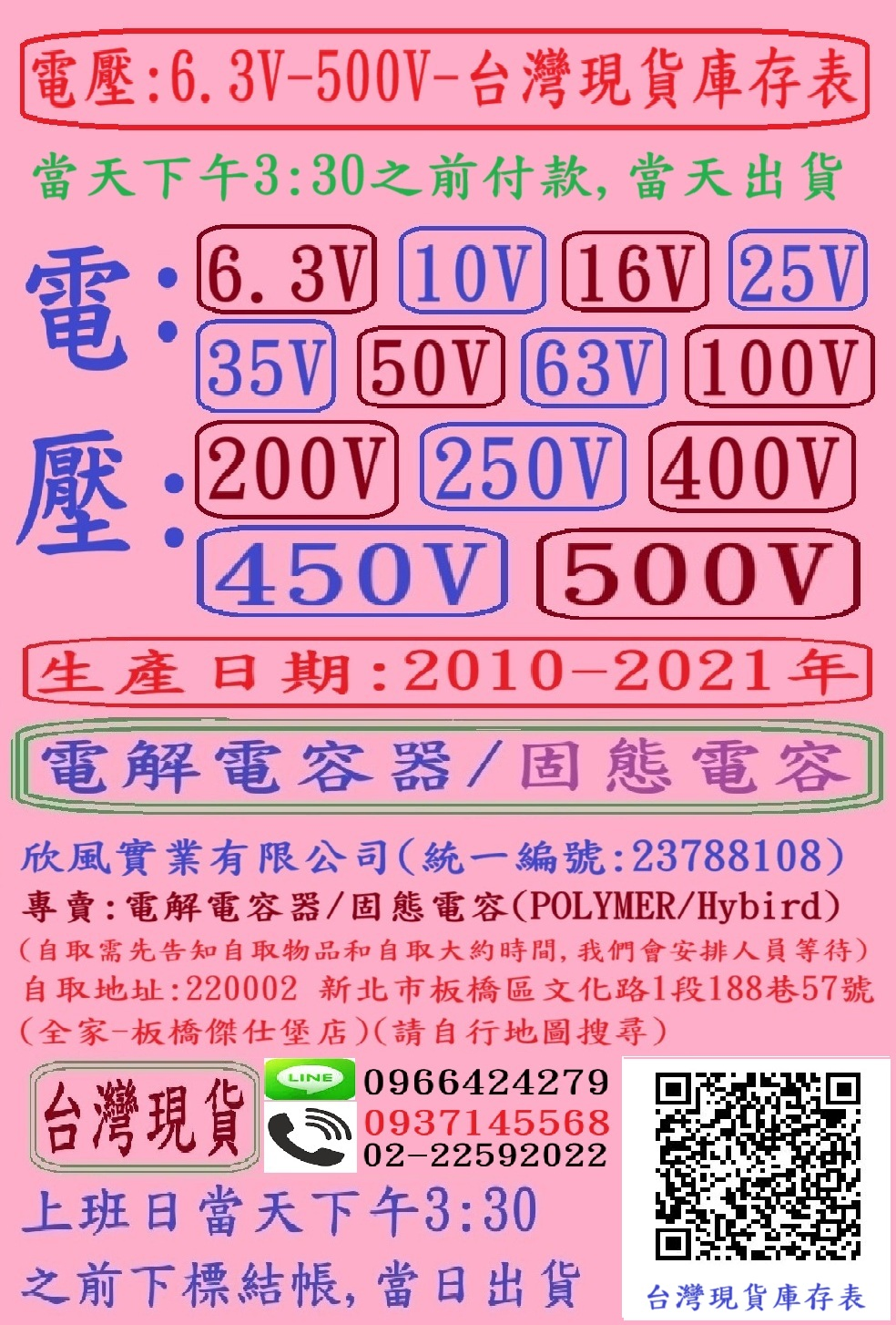 電壓:6.3V-500V-台灣/日本/上海庫存表(生產日期:2019-2024年)-電解電容器(E-CAP/CAPACITORS)