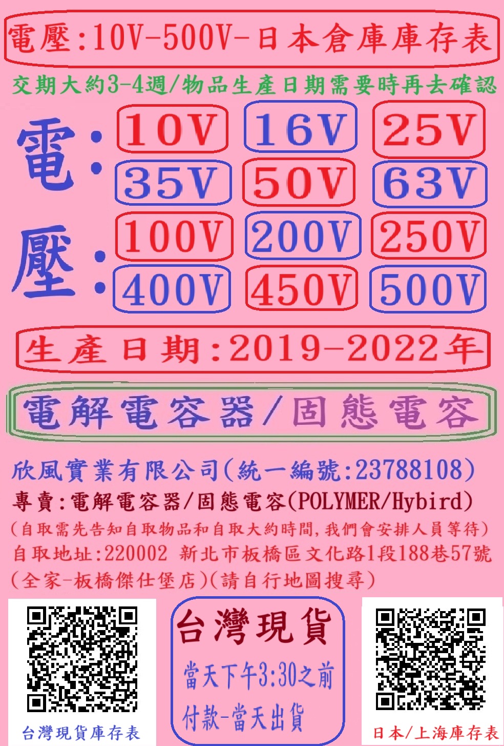 電壓:6.3V-500V-台灣-日本-上海庫存表